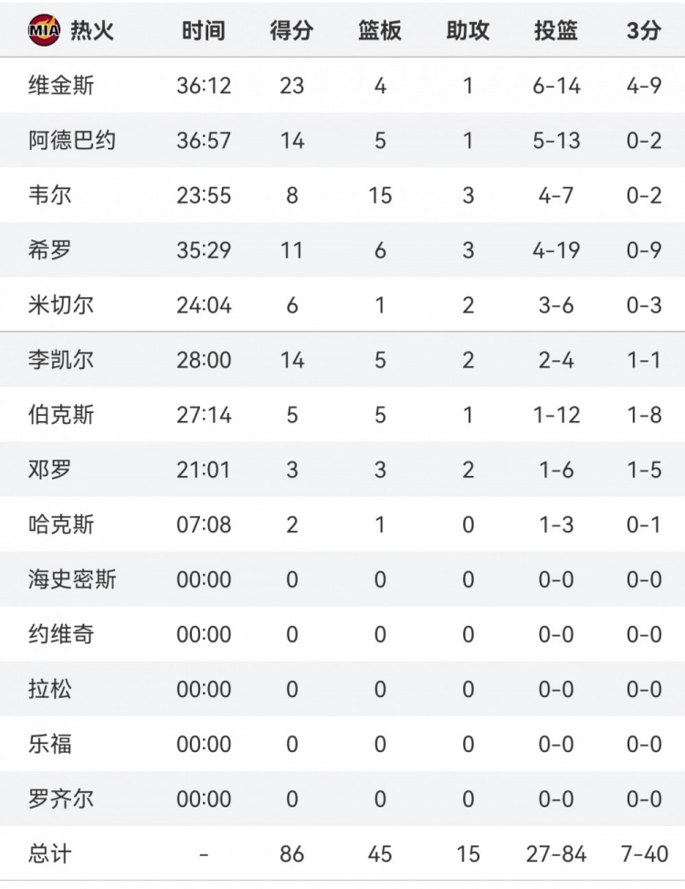 本場比賽,熱火全隊三分手感冰涼。全隊外線共計40中7,僅有維金斯和李凱爾手感在線(維金斯9中4、李凱爾1中1)。