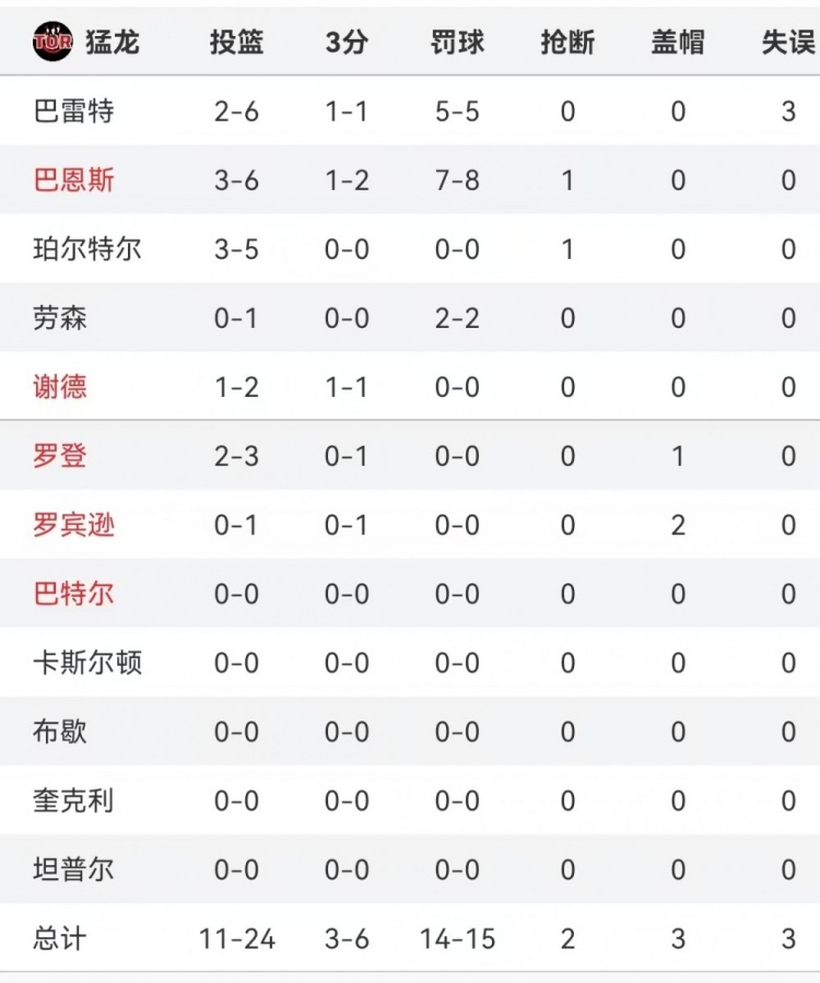 猛龍首節(jié)堅(jiān)決沖擊內(nèi)線頻頻獲得罰球,并且罰球命中率非常不錯,全隊(duì)15次罰球機(jī)會,罰進(jìn)14球。其中巴恩斯8罰7中,巴雷特5罰5中。