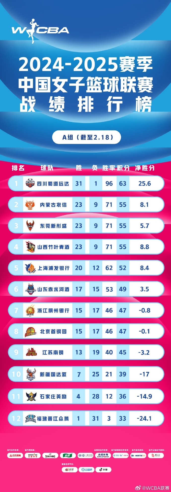 WCBA常規(guī)賽最終排名:A組四川第1 內(nèi)蒙古第2 B組武漢第1