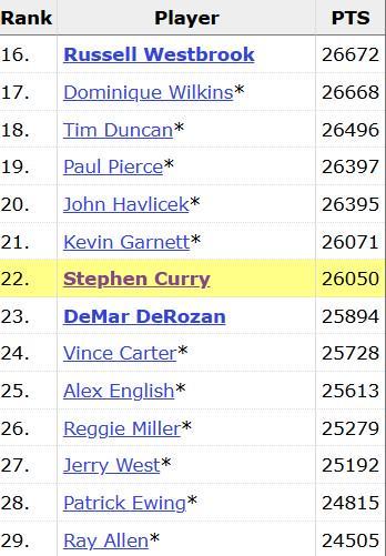 本場比賽之前,庫里總得分為26050分位居歷史第22位,距離第21的加內(nèi)特僅有21分。在第四節(jié),庫里得到了本場第23分,他也完成了對于加內(nèi)特的超越,升至歷史第21位。