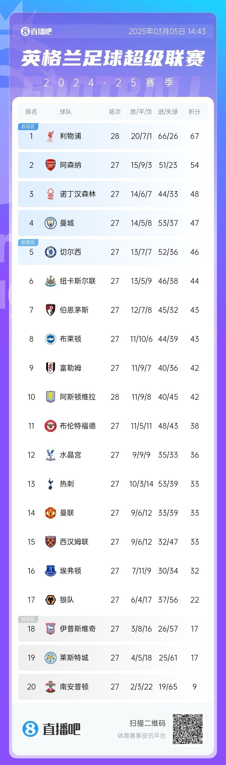 隨著2024/25賽季英超聯(lián)賽進(jìn)入最后三個月,歐戰(zhàn)資格的爭奪可謂是精彩紛呈。目前排名第三的諾丁漢森林與排名第十的阿斯頓維拉僅有6分差距,不過維拉多賽一場。
