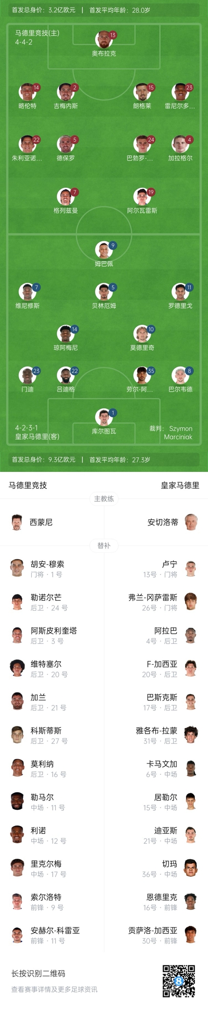 3月13日訊 歐冠1/8決賽次回合,馬德里競技主場迎戰(zhàn)皇家馬德里,賽前首發(fā)名單公布。
