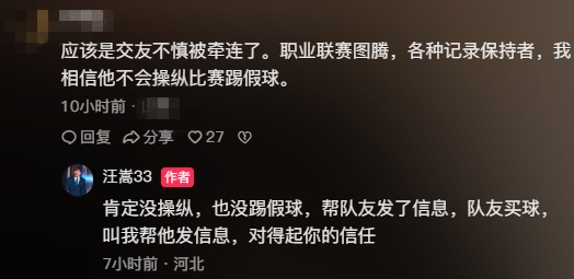 網(wǎng)友:應(yīng)該是交友不慎被牽連了。職業(yè)聯(lián)賽圖騰,各種記錄保持者,我相信他不會操縱比賽踢假球。