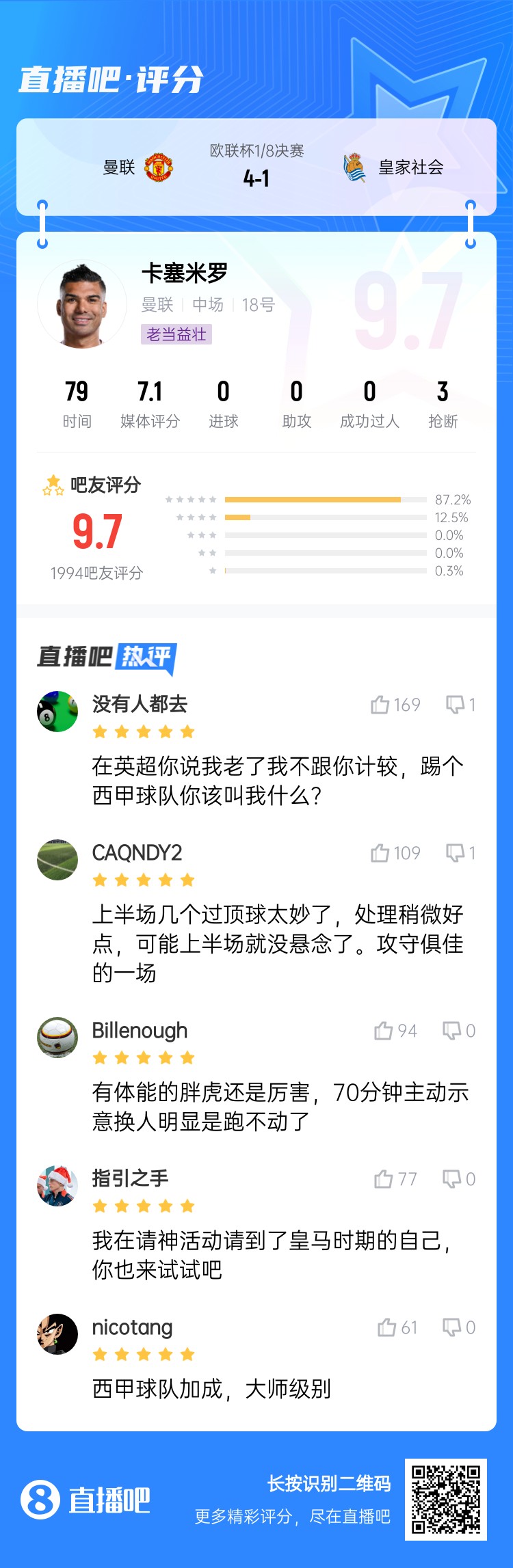 歐聯(lián)1/8決賽次回合,曼聯(lián)4-1戰(zhàn)勝皇家社會??ㄈ琢_本場比賽首發(fā)出戰(zhàn)79分鐘,表現(xiàn)出色,賽后吧友給他打出9.7分的高分。