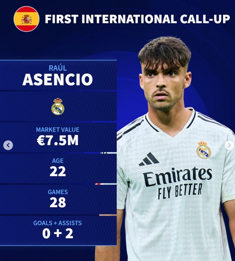 勞爾-阿森西奧(皇馬,西班牙),750萬歐,22歲。28場0球2助攻
