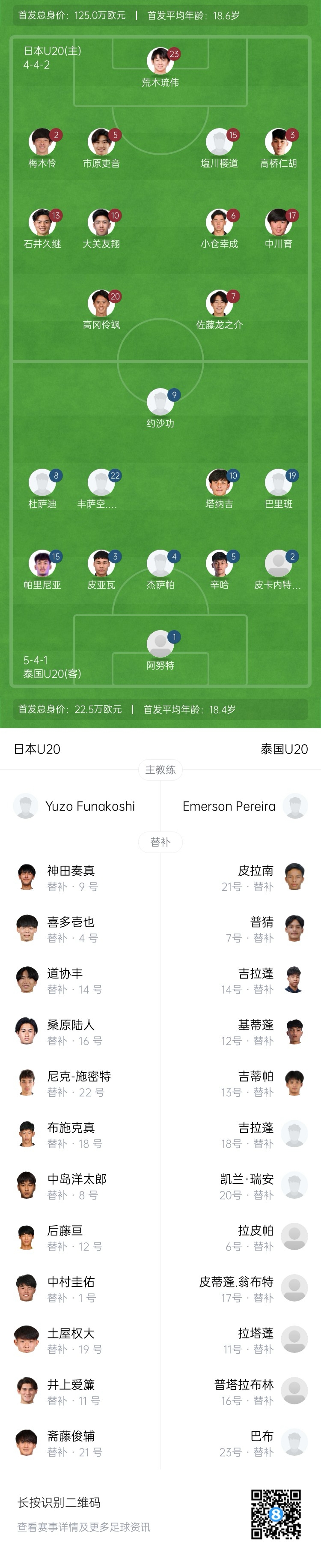 泰國U20首發(fā):1-阿努特、2-皮卡內(nèi)特-勞哈維瓦、3-皮亞瓦、4-杰薩帕、5-辛哈、15-帕里尼亞、8-杜薩迪、10-塔納吉、19-巴里班、22-豐薩空、9-約沙功