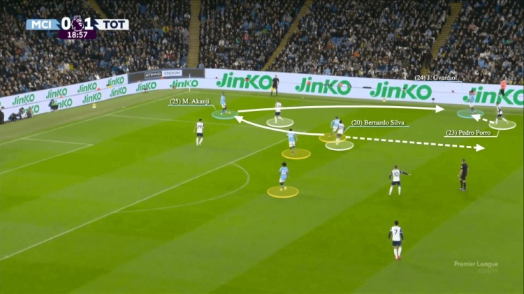 面對(duì)熱刺的壓迫,京多安傳球給貝爾納多-席爾瓦,又傳球給阿坎吉。這里的問題是,所有三名中場(chǎng)球員(下圖黃點(diǎn))都靠得太近了,并且都是為球而戰(zhàn)——熱刺只需要兩名球員都能夠防住他們。當(dāng)阿坎吉傳球給格瓦迪奧爾之時(shí),貝爾納多-席爾瓦確實(shí)完成了一次滲透跑動(dòng),但曼城的慢速進(jìn)攻讓熱刺鎖定了他們。