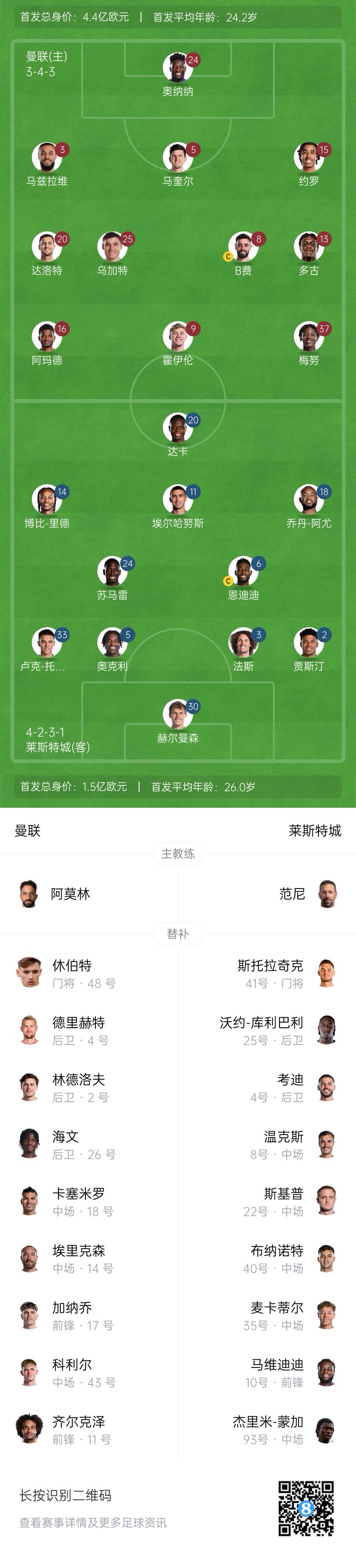曼聯(lián)vs萊斯特城首發(fā):霍伊倫、阿瑪?shù)孪劝l(fā),B費(fèi)出戰(zhàn)多古首秀